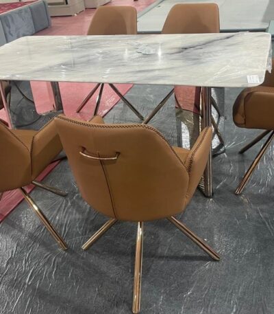 Experience sophistication with our modern luxury dining set. This exquisite collection features a sleek marble-finish tabletop that not only adds character but also enhances the ambiance of your dining area.